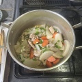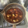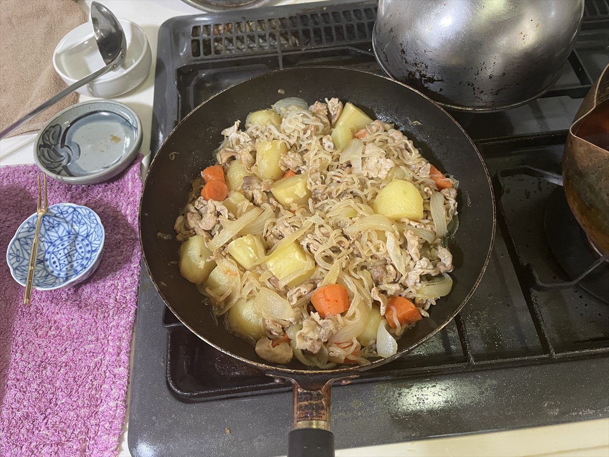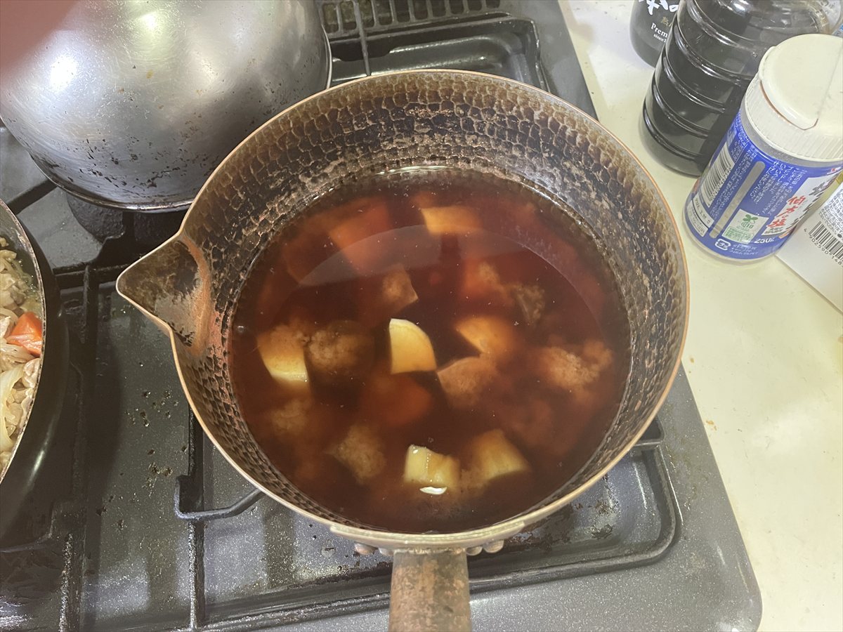 ④だしの素を加えたら蓋をして約10分。中火でコトコト煮たら醤油を入れ更に約10分。中火で蓋をせず時々返しながら煮る。人参が固かったのもう5分蓋をし煮る
