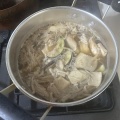 ③白滝・玉ねぎを上に散らすように乗せたら、水・酒・みりん・砂糖を入れてひと煮立ちさせてアクを取る