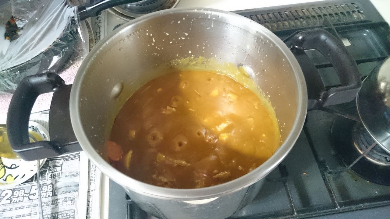 ④バナナを加え材料がやわらかくなるまで弱火で20分煮込む。一度火を止めてルウを割り入れよく溶かします。