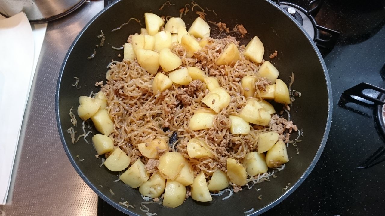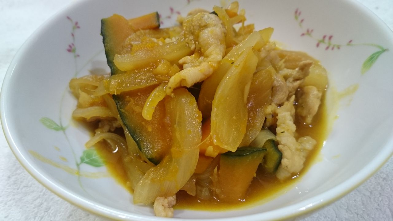 ③香りがたったら、豚肉→かぼちゃの順に炒めて、◎を加える。落とし蓋をして、中火で煮る。5分。