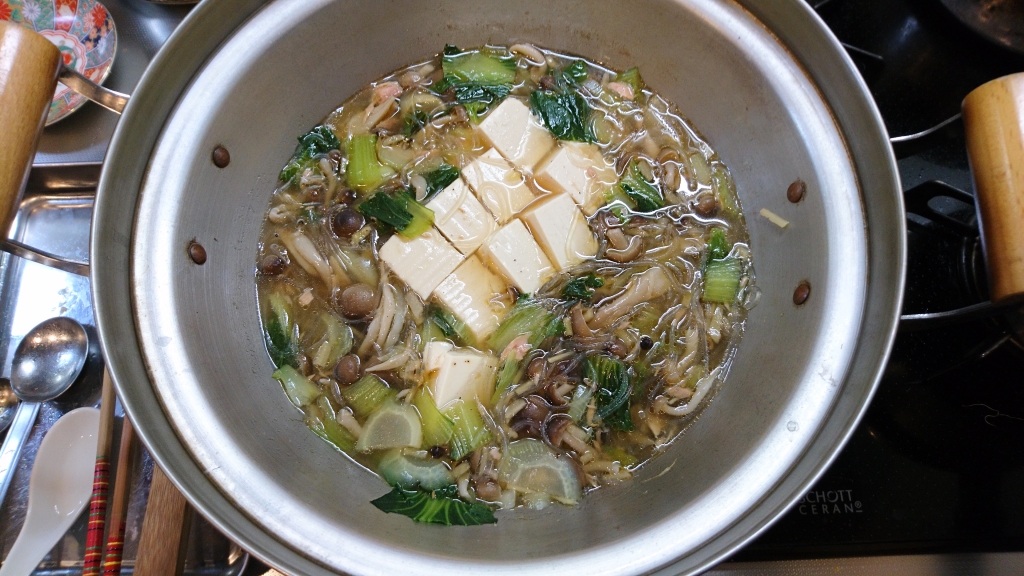 ②水、ほんだし、エノキ、チンゲン菜、わかめを鍋に入れ、中火で温める。火が通ったら、弱火にし、豆腐を入れる