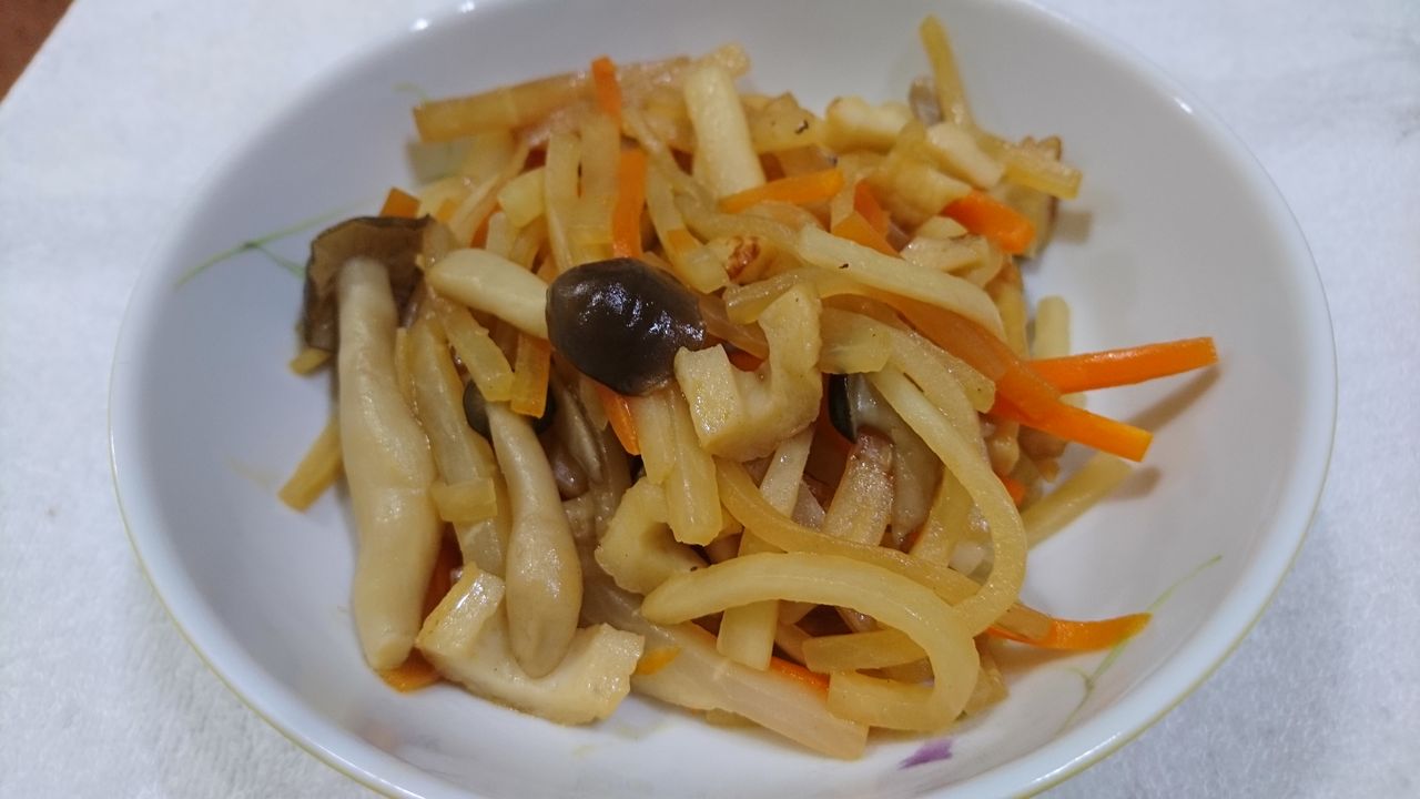 歯の悪い父に考慮し、人参・ごぼうはレンジで2分半チンしました。さらには念入りに炒めたのに、ごぼうの固さは微妙に残りました。僕らは食べれましたが、歯の悪い父には食べれませんでした。失敗です。味付けも、ホントは大葉が入るのですが、姉が大葉が嫌いなので抜きました。梅干し2個では味付けが弱かったです。