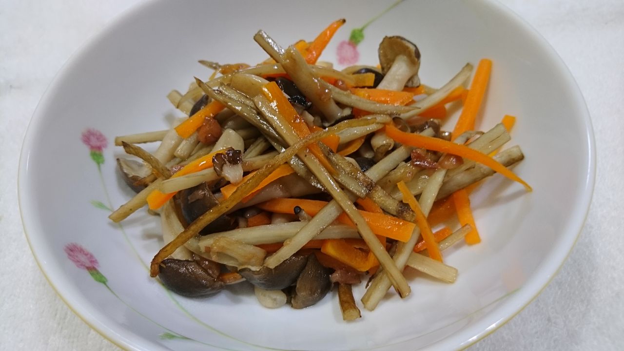 ①ごぼうは包丁の背で皮をこそげ、千切りにして薄い酢水に浸けておく。10分ほどしたらザルにあげて水を切る。レンジで2分半チン。