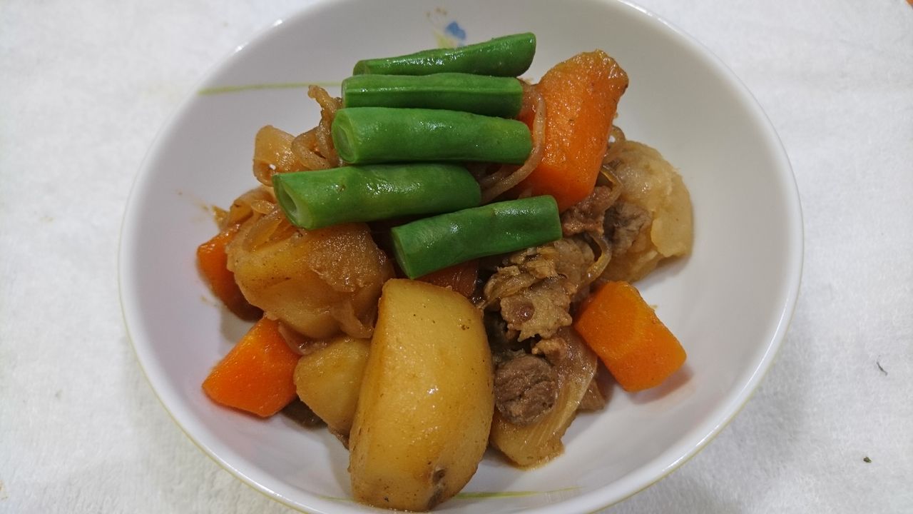 ①玉ねぎはくし切り、人参は乱切り、じゃがいもは8等分くらいに、糸こんにゃくは熱湯でアク取り、いんげんは熱湯に塩を入れ、3分茹でる