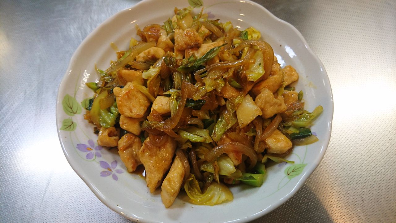 ③同じフライパンに油をしき、片栗粉をまぶした鶏胸肉をしっかり火が通るまで炒め、キャベツ玉ねぎを戻し☆を加えて炒めて完成