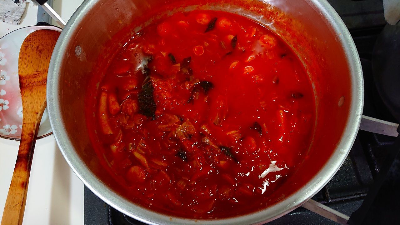 ⑦大きな鍋に移し、そこに水と残りのトマトジュースを加え、再び煮立たせる