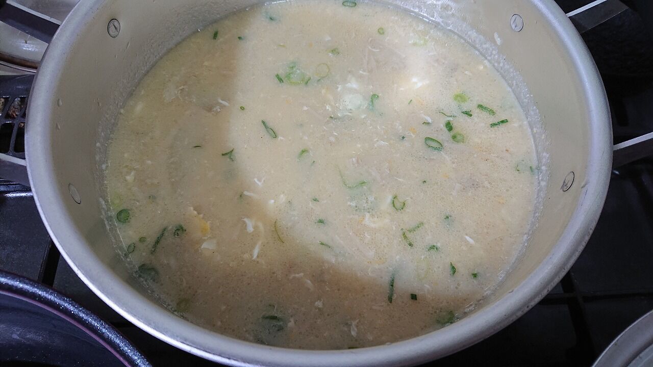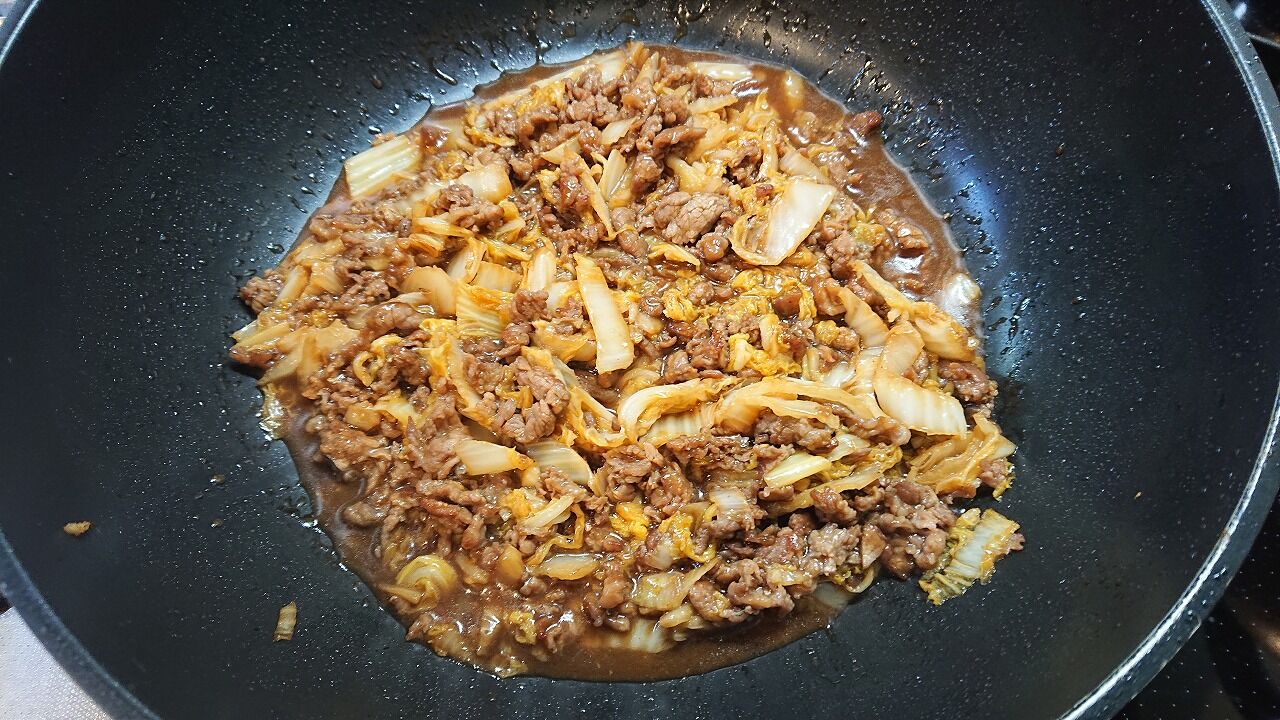 ②フライパンに油を引き、①を炒め、大鍋に出汁を沸かし、そこに炒めた物を投入。一口大に切った豚こまを加え、沸騰したらアクをとり、水分が少なくなった分、水追加