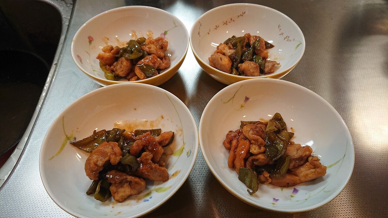 ④③で出た余分な油を拭き取る。ピーマンと○を入れ汁気が無くなり照りが出るまで炒め煮し完成
