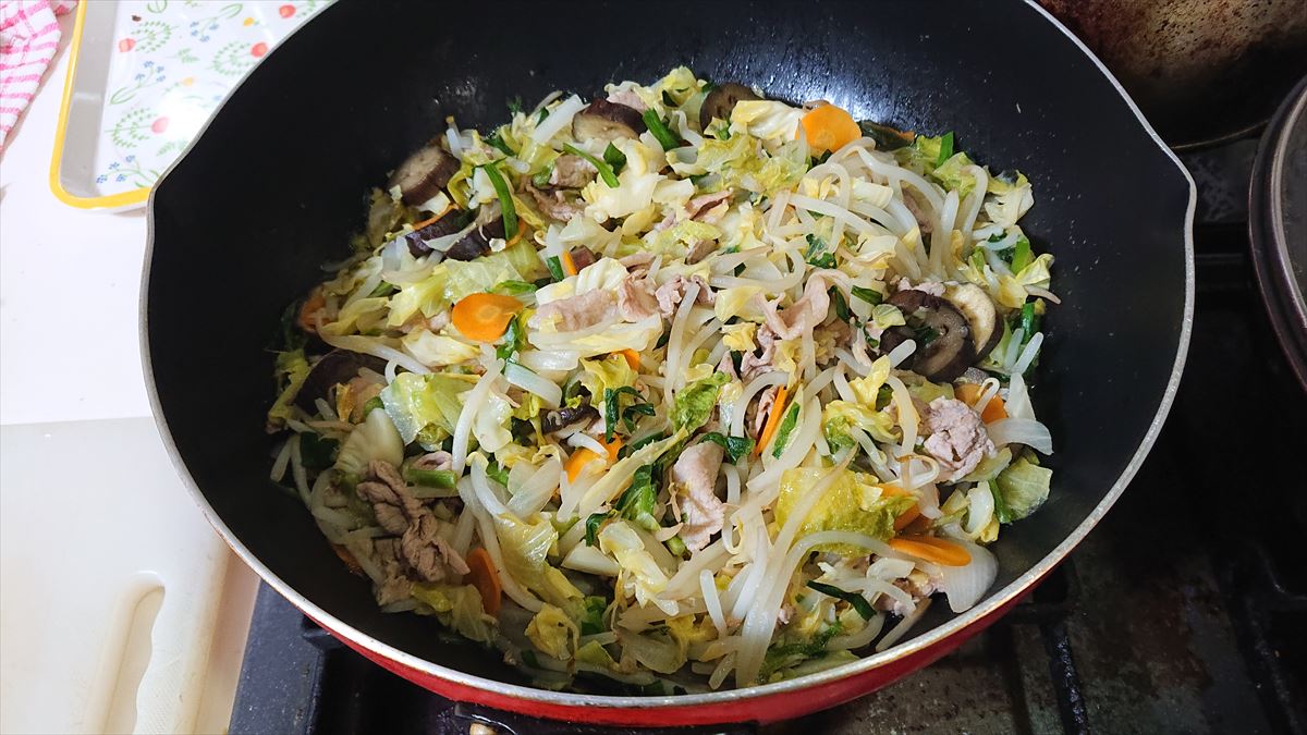 ③肉が8割くらい焼けたら、チンしたナス、玉ねぎ、人参を入れ炒まったら、もやし、キャベツ、レタス、ニラを入れしんなりするまで炒める。野菜から結構な水が出る