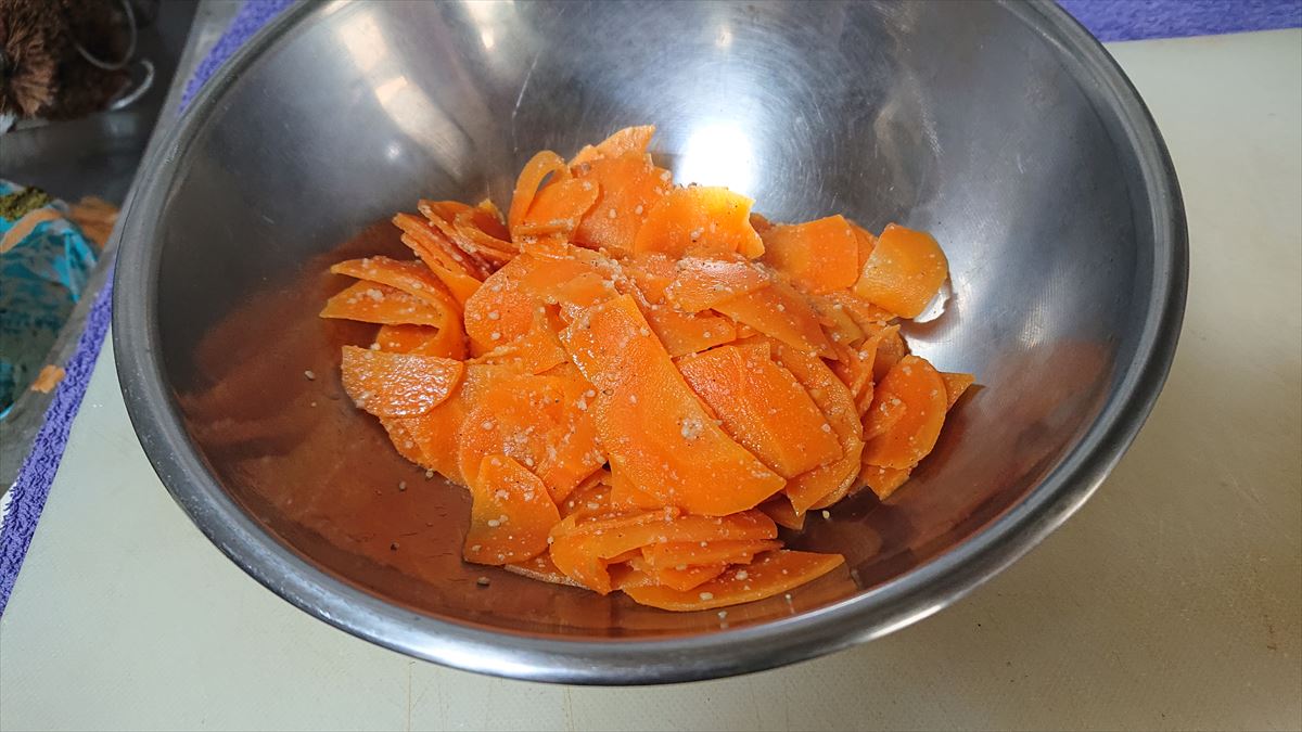 2022年05月27日 人参のごま和え 材料人参 大1本Aいりごま 大1砂糖 小1醤油 小1/2作り方①人参はスライサーで薄く半月切り②鍋にお湯を沸かし①を3分茹でザルに上げる③ボウルにAを合わせ②が熱いうちに加え、混ぜ合わせる。粗熱をとり、味をなじませる評価3味に深みがありませんでした。出汁で茹でればよかったと後悔してます。