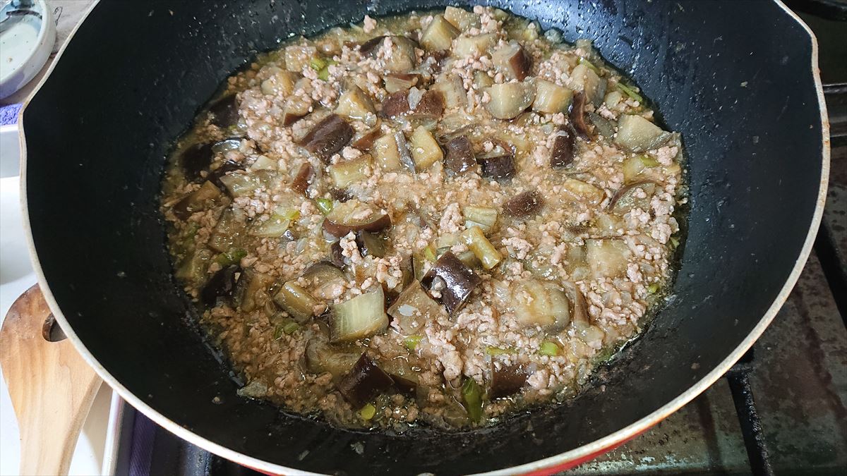 2022年05月27日 ナスのそぼろ煮 材料豚ひき肉 160gナス 3本玉ねぎ 1個さやいんげん 5本油 大1水溶き片栗粉 大1分A出汁 250ml醤油、砂糖 各小4作り方①ナスは1cm角に切り、水に5分つけアクをとり、水気を切る。玉ねぎはチョッパーで粗みじん切り、さやいんげんは筋をとり3mm幅の輪切り②フライパンに油を中火で熱し、玉ねぎを炒める。しんなりしてきたら豚ひき肉、ナス、さやいんげんを加え炒める③肉の色が変わったらAを加え炒め煮にする。野菜が柔らかくなったら、水溶き片栗粉を加えとろみをつける評価3.5とろみをつけるのが良いです。出汁が活きて美味しいです。