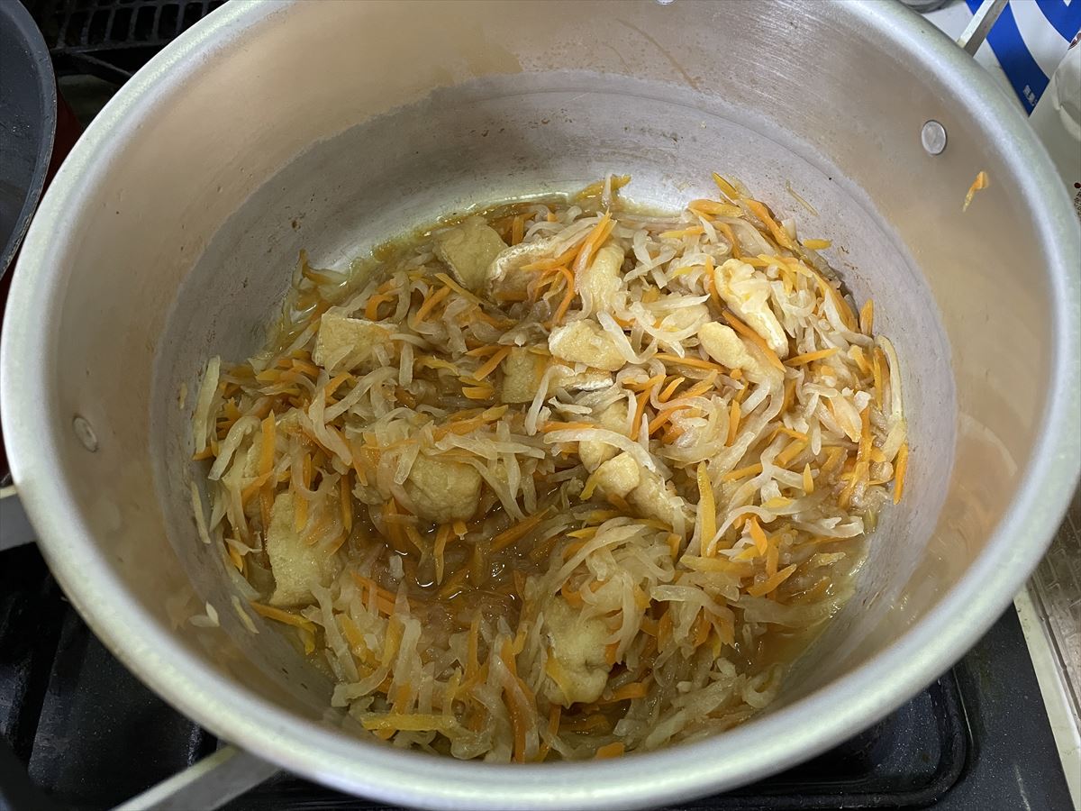 2022年09月28日 シンプルに!!大根と人参と油揚げの煮物(2度目) 材料大根 15cm人参 1本油揚げ 1枚サラダ油 大1醤油 大2酒 大2砂糖 大1水 200cc出汁の素 1袋作り方①大根と人参を皮を剥きスライサーで千切り②油揚げを油抜きして細切り③鍋にサラダ油をしき熱し、大根をしんなりするまで炒める④人参を加えしんなりするまで炒める⑤砂糖を入れ混ぜる⑥油揚げを入れる⑦調味料と水を入れ汁がなくなるまで煮詰める評価4出汁の効いた美味しい料理です。癖が無いです。