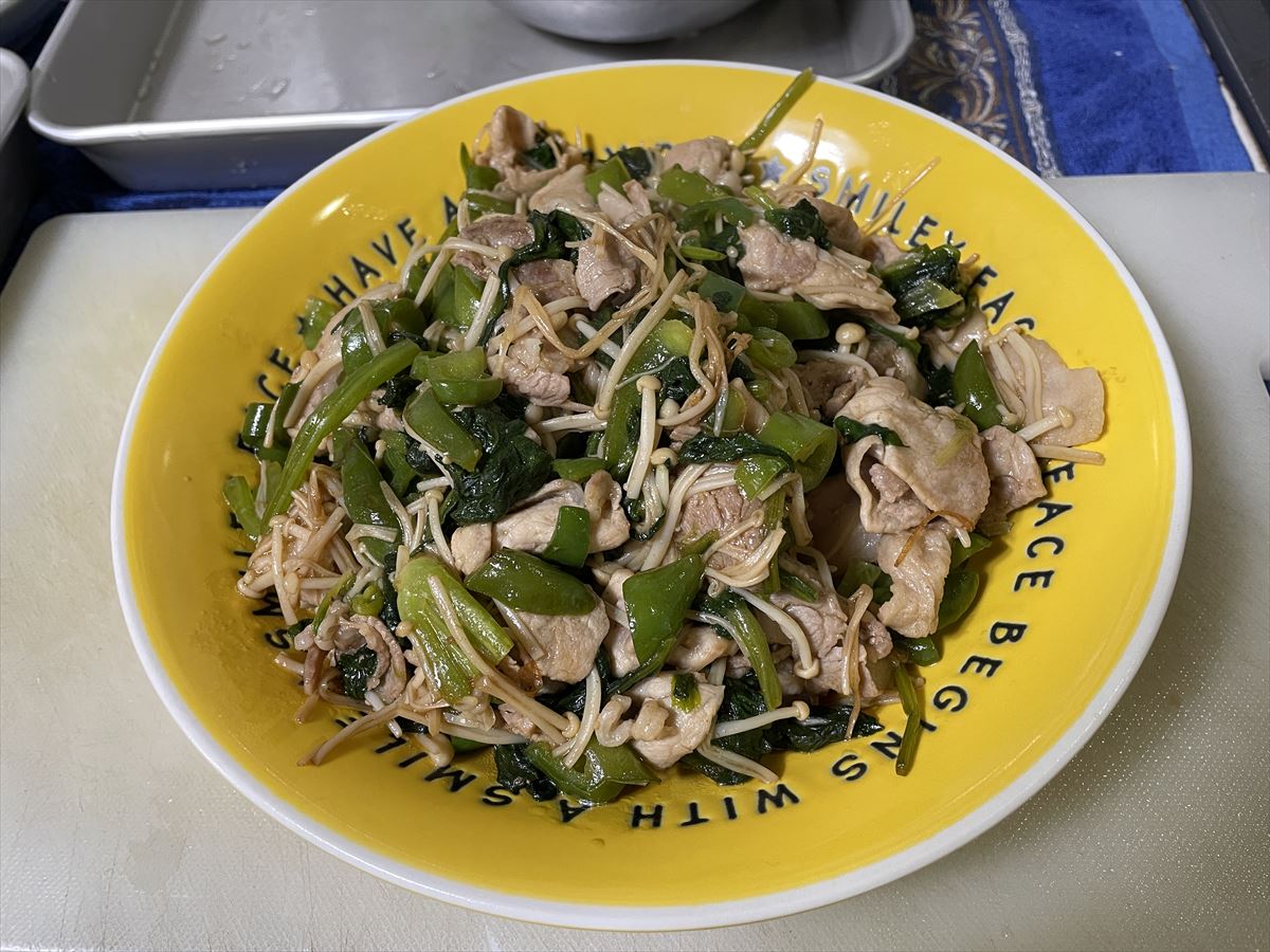 2022年09月28日 緑の野菜炒め(2度目) 材料豚薄切り 200gほうれん草 1束ピーマン 5個えのき 1袋ごま油 大1●オイスターソース 小4●醤油 小4●砂糖 小2●酢 小4作り方①ほうれん草は1分茹で、食べやすい大きさに切る、ピーマンは細切り。えのきをバラし半分に切る ②フライパンにごま油を熱し、一口大に切った豚肉を炒める。色が変わったらピーマンを追加ししんなりするまで炒める③ほうれん草とえのきを入れ軽く混ぜ、●の調味料を入れて全体に馴染ませたら完成評価3.5味付けの良い美味しい料理です。酢も存在感あります。