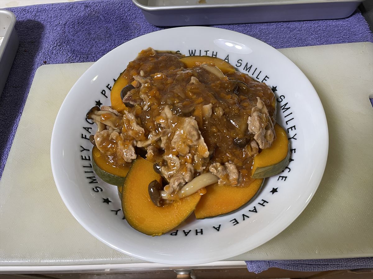 2022年09月30日 蒸しカボチャの豚肉あんかけ(2度目) 材料かぼちゃ 1/2豚こま 200g人参 1/2本玉ねぎ 1/4生姜 1かけ片栗粉 大1だしの素 1袋醤油 大5みりん 大3砂糖 大1作り方①かぼちゃを薄切り、玉ねぎ、人参、生姜、はみじん切り。豚こまは一口大に②フライパンに豚肉を炒め、油が出たら玉ねぎ、人参、生姜、を入れ、水100ccを入れ調味料を入れ煮る。10分。③かぼちゃを蒸し器に入れ柔らかくなるまで10分蒸す④蒸したかぼちゃを皿に乗せ、その上に②を乗せる評価4.5前回は挽き肉で作りましたが、今回は無かったので豚こまで代用しました。美味しいです。