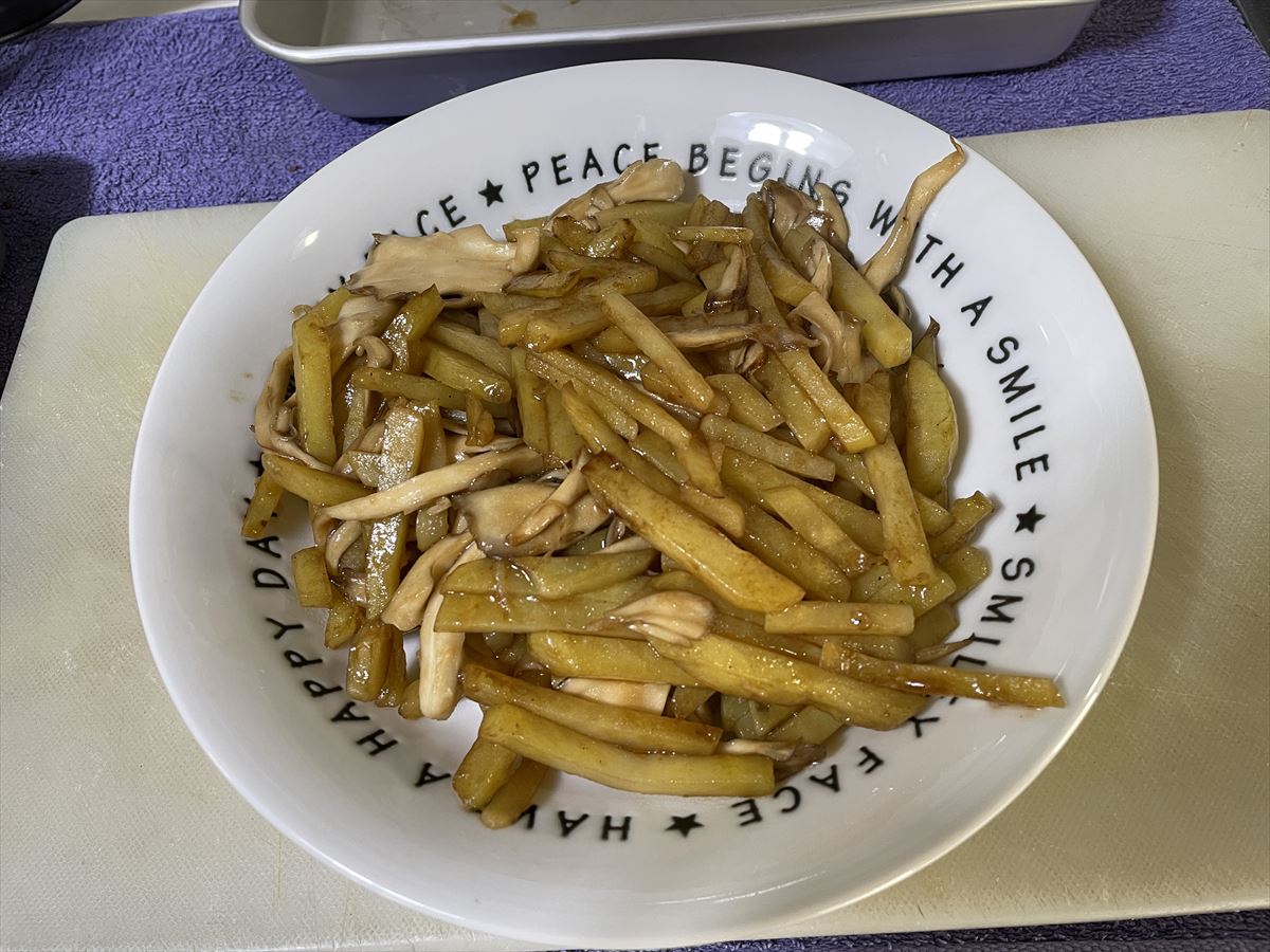 2022年09月30日 じゃがいもと舞茸の中華キンピラ♡常備菜♡(2度目) 材料じゃがいも中 2個舞茸 1パック♡酒 大1♡めんつゆ 大1♡オイスターソース 大1♡中華だし 小2♡砂糖 小2ごま油 大1作り方①じゃがいもは皮を剥き、細切りしレンジで3分チン。舞茸は手でほぐしておく②フライパンにごま油を熱し、じゃがいもが透き通るまで炒める③舞茸も投入し、しんなりしたら、♡の調味料を入れて出来上がり評価4大変美味しい料理です。6年近く経って2度目の調理ですが、もっと作っておけばよかったと思います。