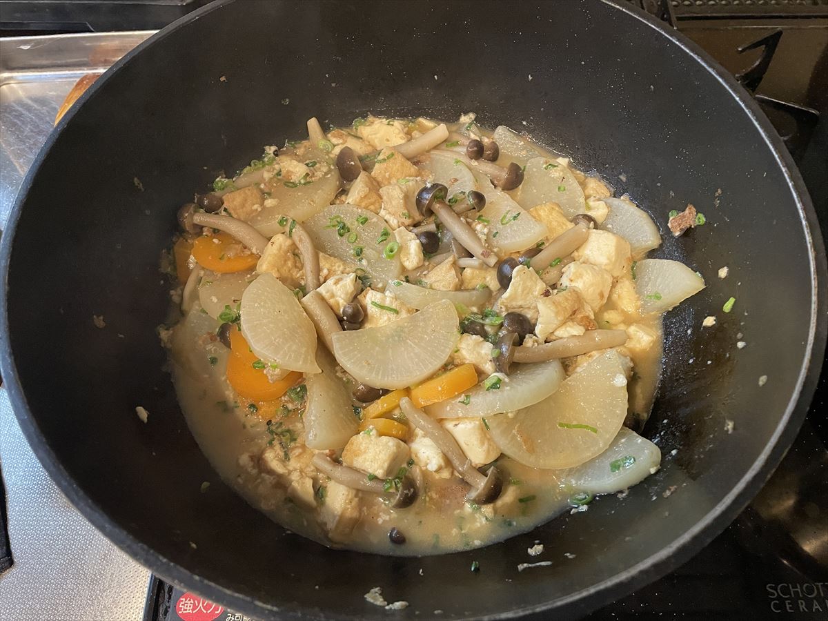 ③同じフライパンにサラダ油大1を熱し手羽中と生姜を炒めます。七味を振り焼き色がついたら②を戻し馴染んだら、水とだしの素を入れ沸騰したら弱火にし10分煮込みます