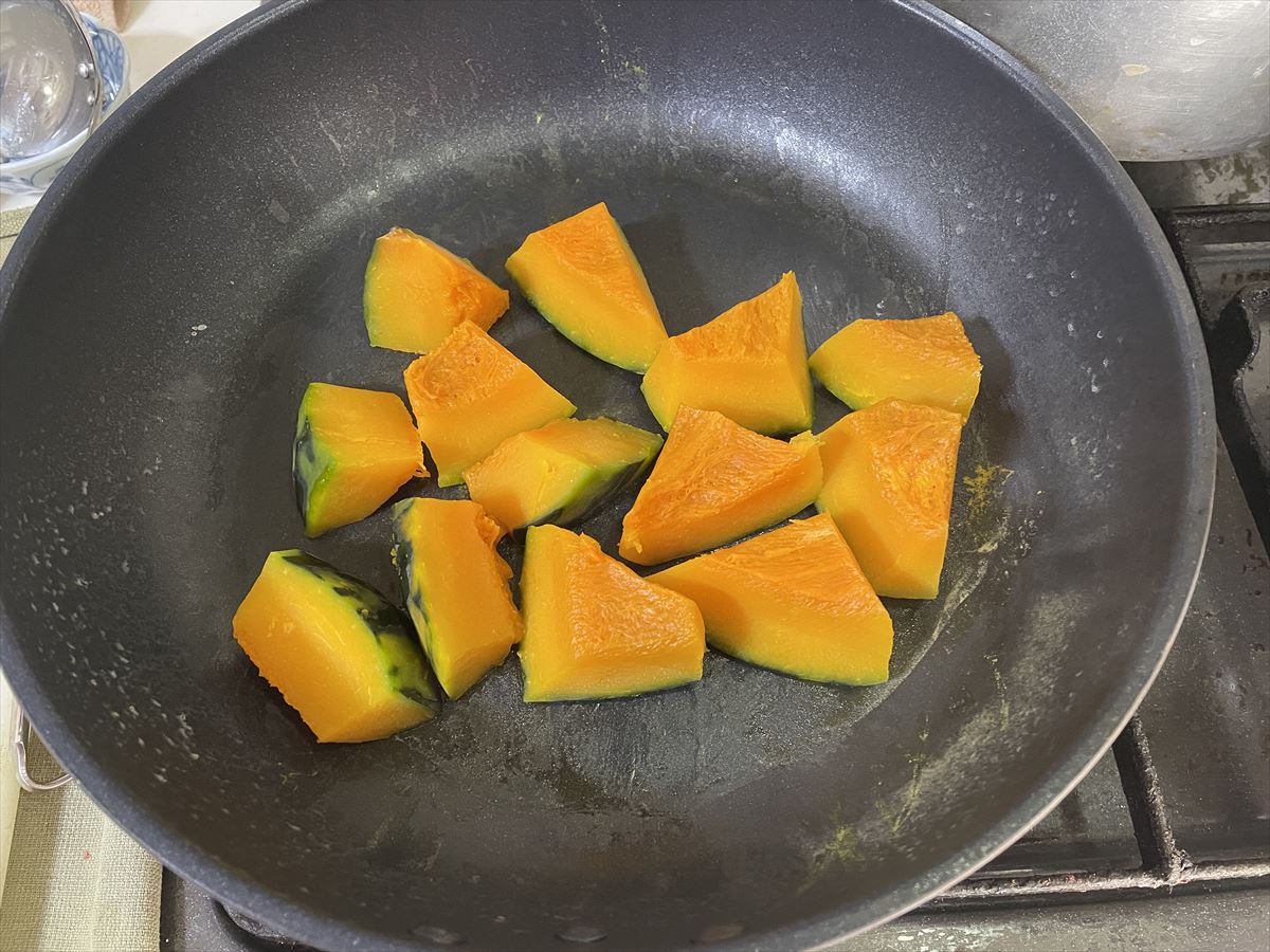 ②フライパンにサラダ油大2を熱し、ナスと玉葱を炒め、ナスがしんなりし玉葱が飴色になるまで炒め一旦取り出す