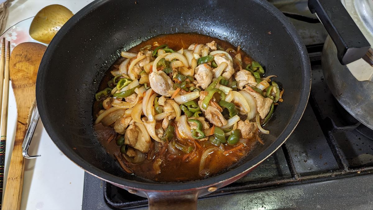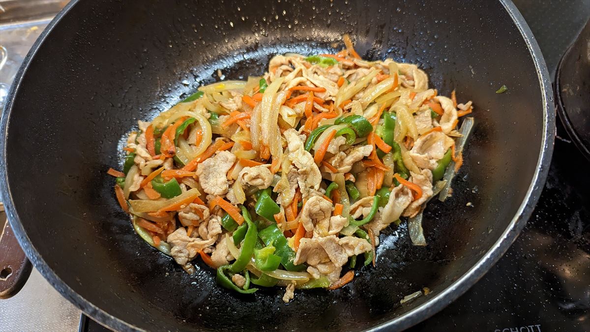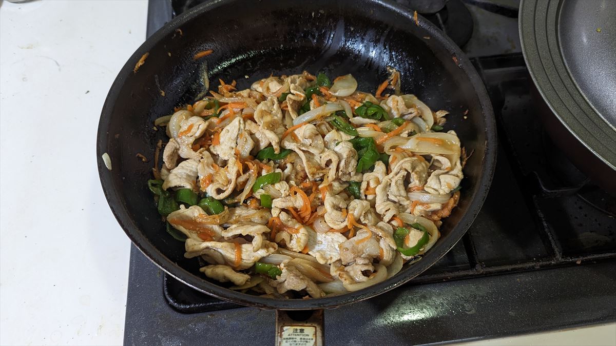 ④フライパンに胡麻油大1をしき、玉ねぎが飴色になるまで炒め一旦取り出す、ピーマンもごま油大1で炒め、しんなりしたら一旦取り出す。玉ねぎとピーマンと人参は一緒にしておく