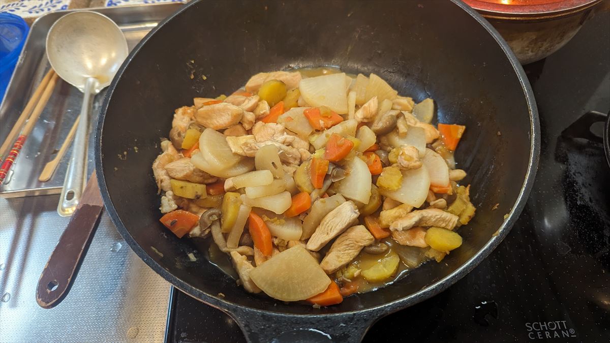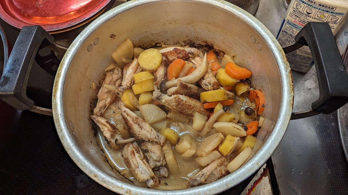①サツマイモは輪切り、大根・人参は銀杏切り、しめじはバラす。鶏胸肉は一口大にそぎ切りして、片栗粉をまぶす。