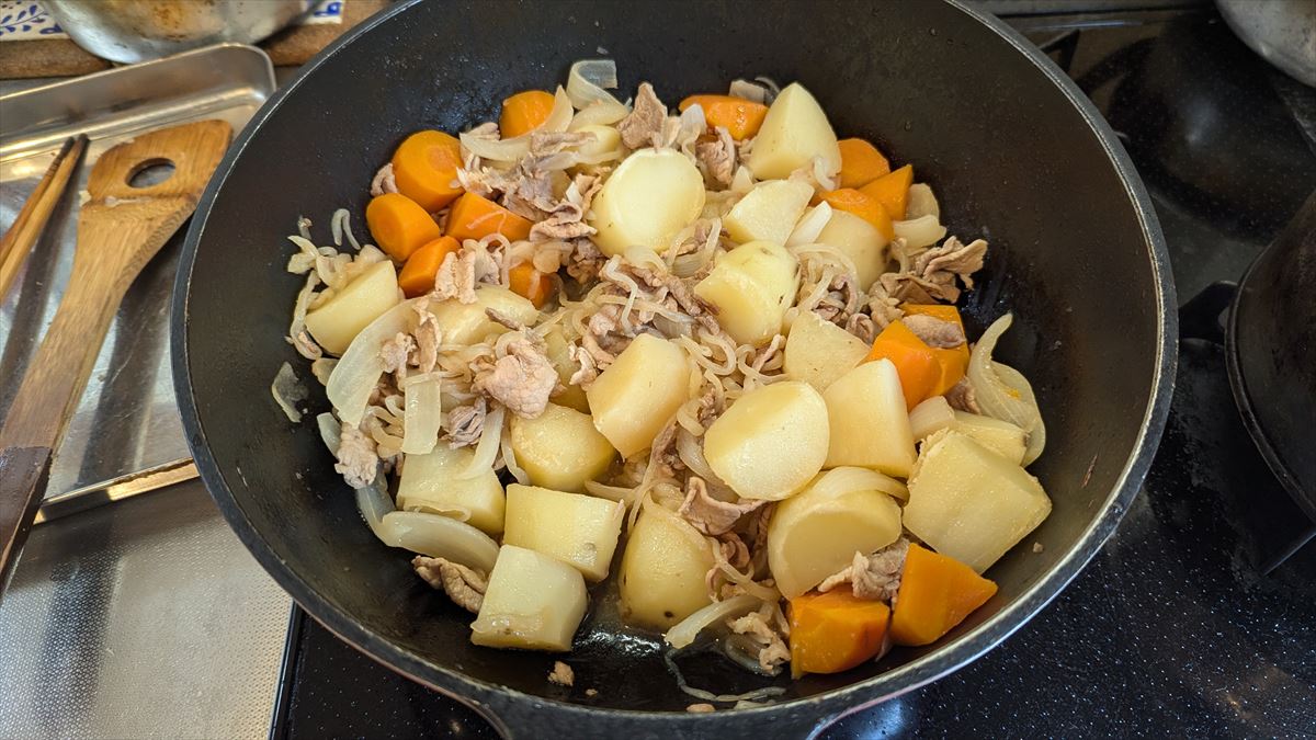 ②サラダ油(適量)を入れた鍋で豚肉を炒め、白くなったら人参とじゃがいもを加えて軽く炒める。