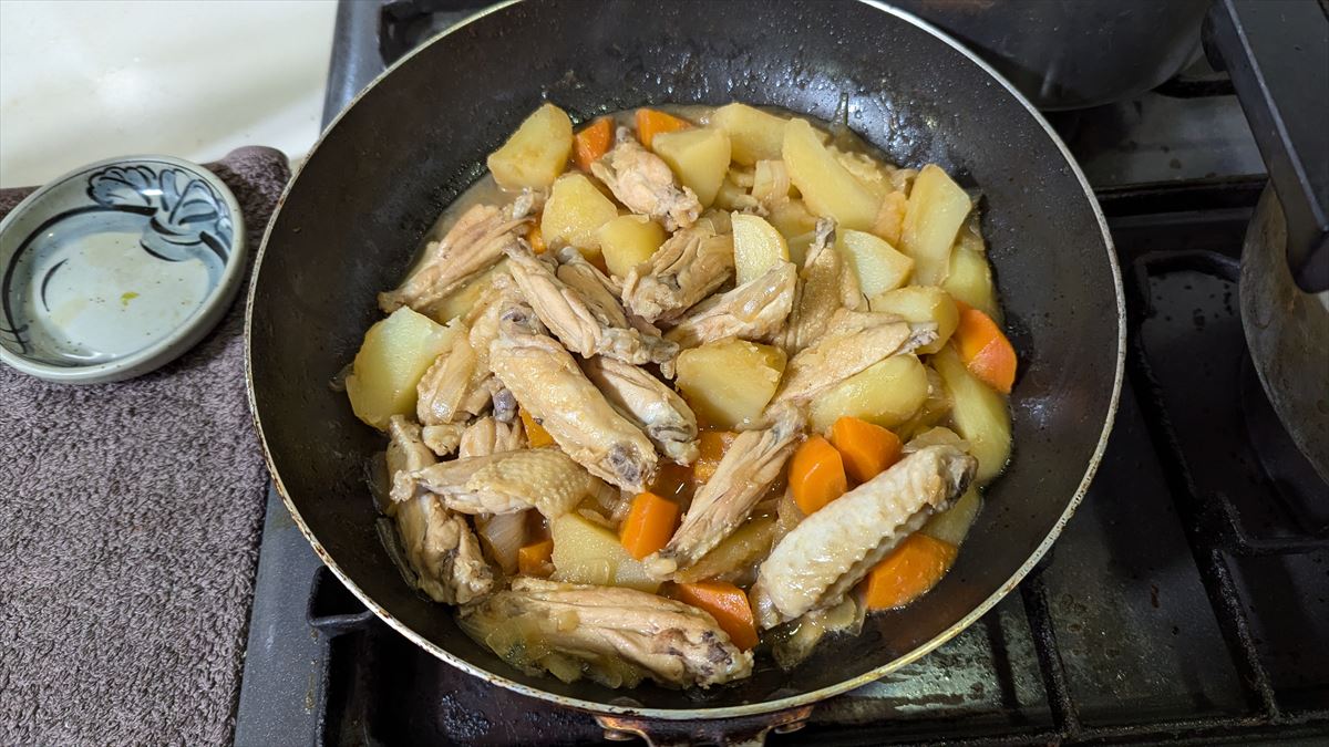 2024年11月21日 じゃがいもと柔らかな手羽中の煮物♥簡単☆(3度目) 材料じゃがいも 4個手羽中 16本人参 1本玉ねぎ 1/2個ごま油 大1☆砂糖 大1☆出汁の素 1袋☆醤油 大2☆水 2カップ作り方①じゃがいもは皮を剥き一口大、人参はスライサーで輪切り、玉ねぎはくし切り②フライパンにごま油を入れて中火にかけ、手羽中を入れ焼き色が両面つくまでやる③①を入れ玉ねぎが崩れ飴色になるまで炒める④別鍋に☆を用意し、③を入れる⑤中火で蓋をして10分煮ます⑥蓋を開けさらに10分煮る。少し置いて味が染みてから食べる評価4簡単だけど美味しい料理です。薄味好きな親戚に合わせ醤油はレシピより大幅に減らしました。