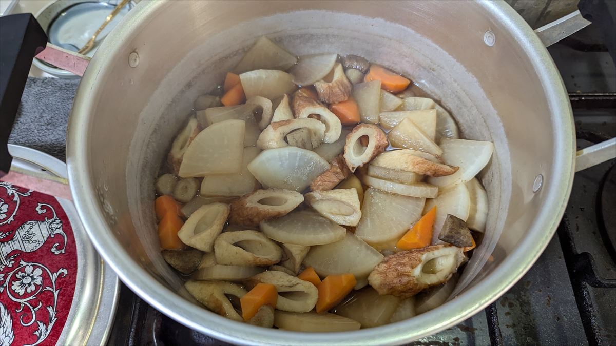 2024年11月28日 ごぼう、人参、大根とちくわの煮物(2度目) 材料人参 1本ごぼう 1本大根 200gちくわ 3本●水 250cc●昆布出汁 1袋●砂糖 大1●醤油 大2●みりん 大1作り方①人参は皮を向いて小さく乱切り、ごぼうは皮をこそげて小さく乱切り、大根は5mmの銀杏切り②ちくわは斜め切り③人参、ごぼう、大根は一緒にラップしてレンジ500wで5分加熱④鍋に●を入れて加熱し、沸騰したらちくわと③を入れて煮る⑤煮汁が1/4になるくらいまで煮る、20分くらい評価3.5本来は出汁の素でやる料理ですが、昆布出汁で代用しました。昆布出汁の方が美味しいかも。20分煮るとごぼうも柔らかくなり美味しいです。味付けあっさりで美味しいです。
