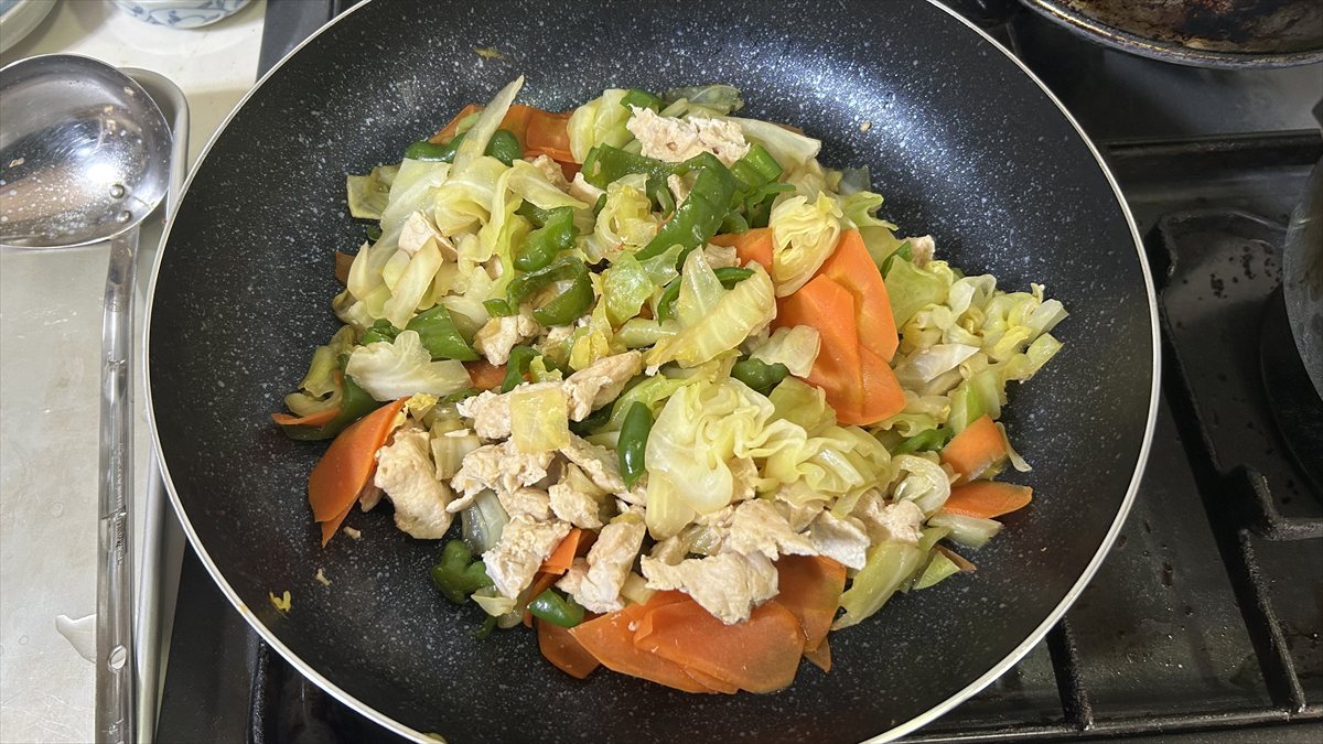 ④にんにくの香りが立ってきたら、もやし、ハムを投入し炒める