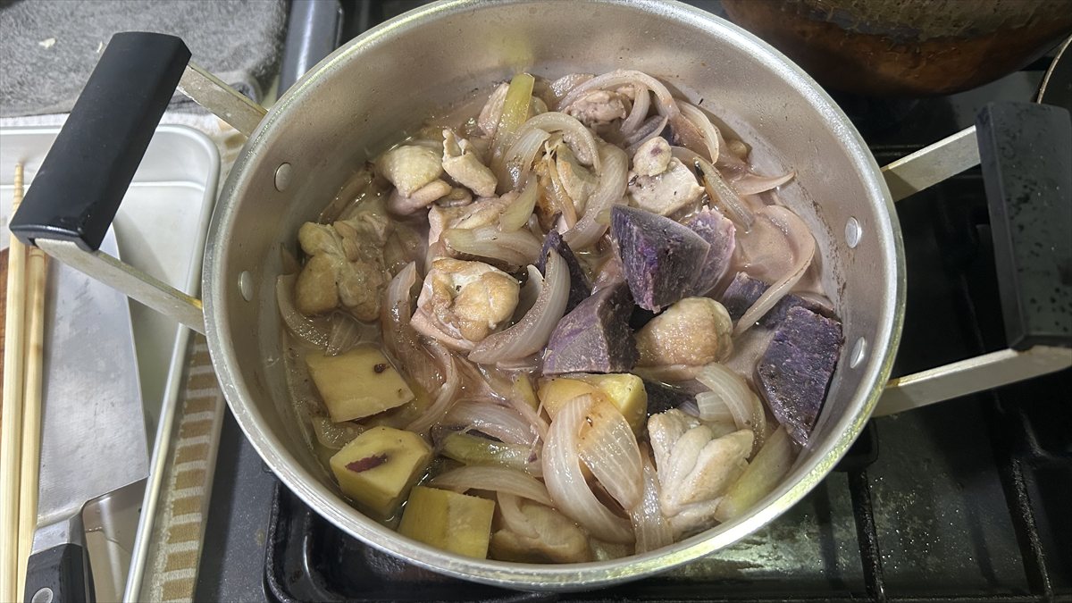 ⑦グツグツしてきたら鶏胸肉と◎を入れて、落とし蓋をしてさつまいもに楊枝が通るまで煮ます(10分)