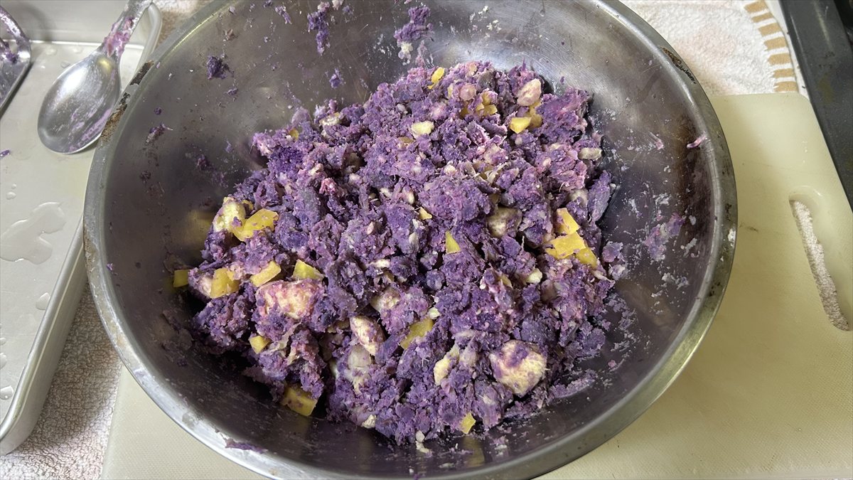 ⑤さつまいもに焼き色が付いたら、たまねぎを入れて炒めます