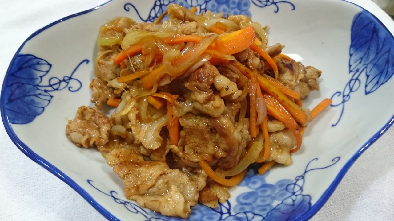 ②肉を10分くらいねかしたタイミングで、玉ねぎ、にんじんを切る。にんじんは確実に柔らかくするため、レンジでチン。先に野菜だけで炒めはじめる。 炒めた後、別皿に野菜をとっておく。