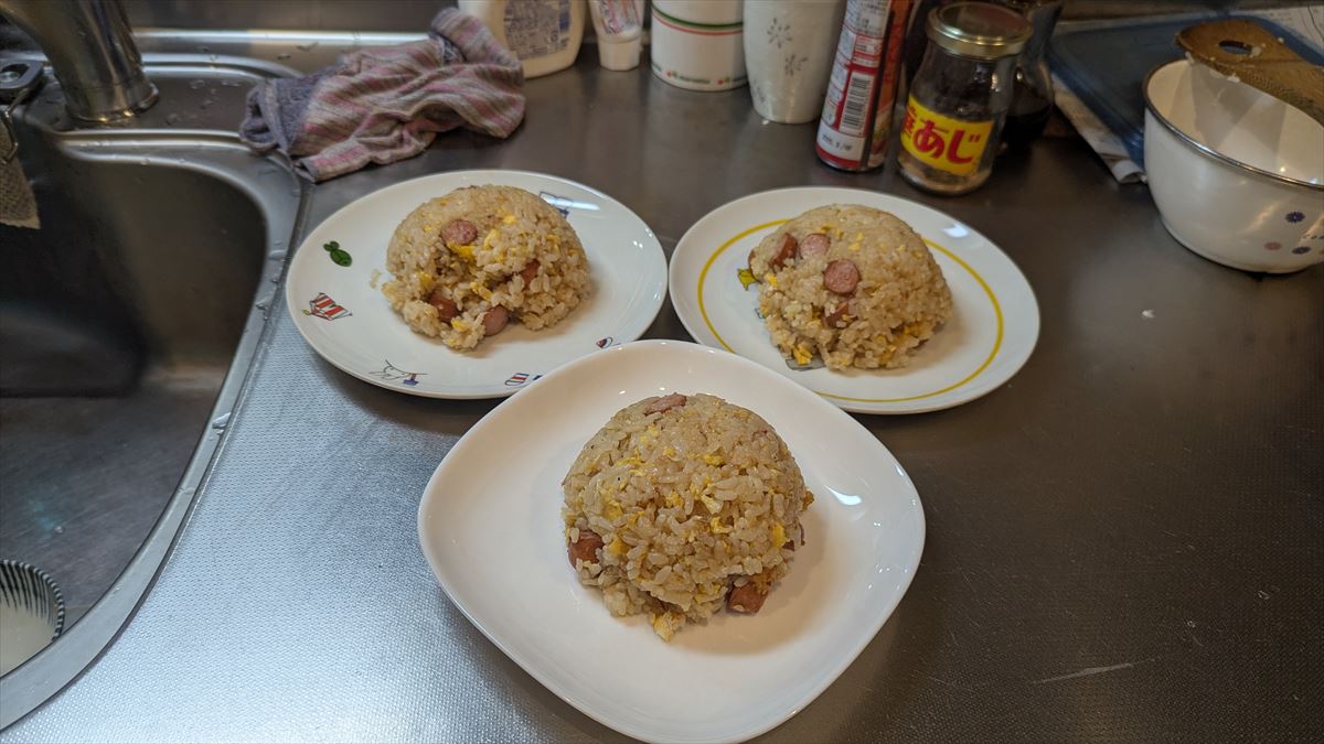 ①冷や飯はレンジでチン。卵は溶きほぐす、ウインナーは小口切り