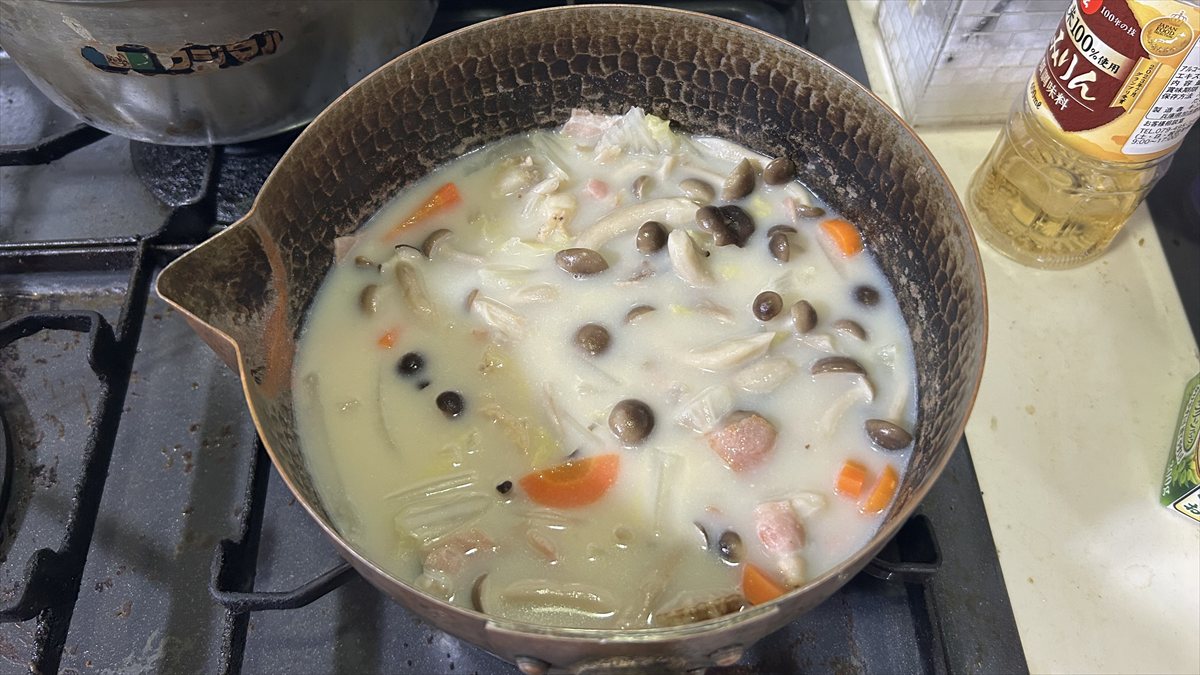 ④③に②のスープお玉2杯を移し、ホタテに火が通るまで中火にかける。3分。ここで塩コショウ