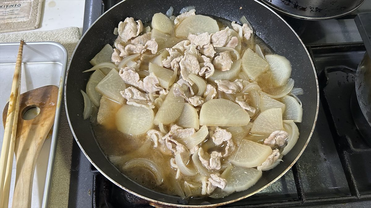 ⑥大根と玉ねぎを入れ、玉ねぎがほぐれるまで炒める