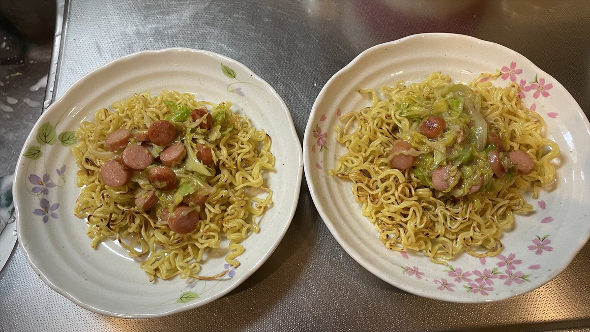 ②フライパンにサラダ油を熱し、焼きそばを投入、円形に整える